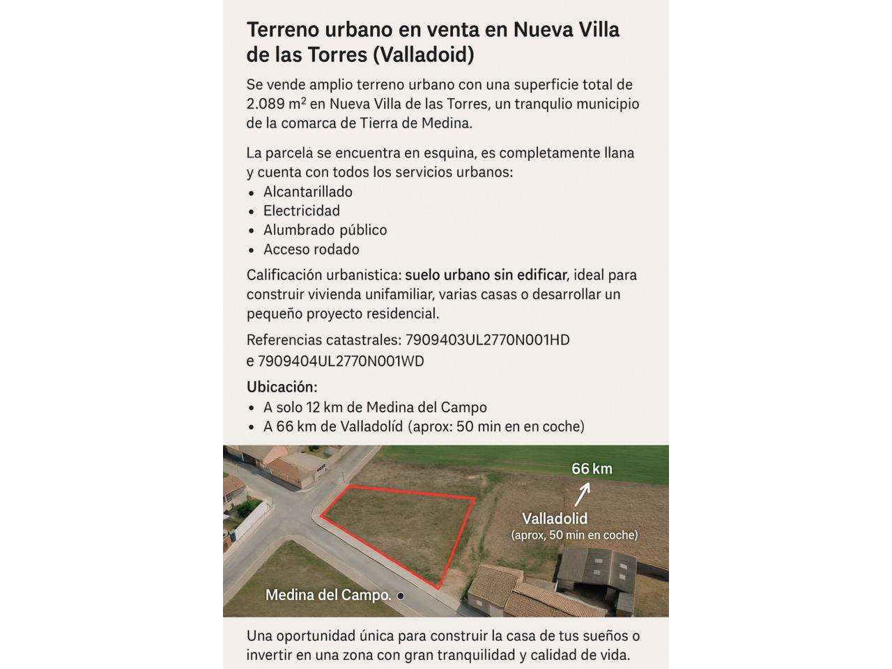 Se vende amplio terreno urbano con una superficie total de 2.089 m² en Nueva Villa de las Torres, un tranquilo municipio de la comarca de Tierra de Medina.